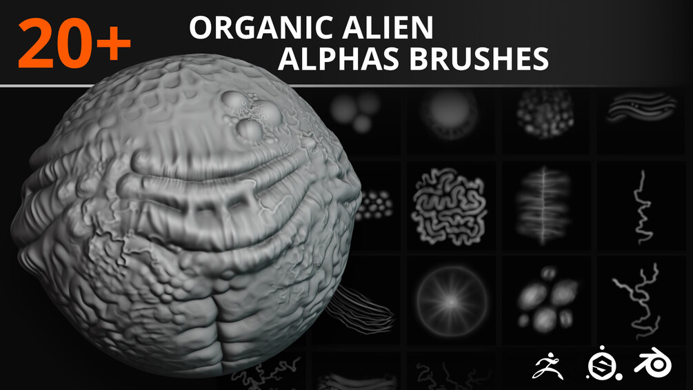 This product contains more than 22 high-quality organic alphas/brushes that can be used with ZBrush and Blender or any sculpting software. This is perfect for doing an organic character or alien prop theme.