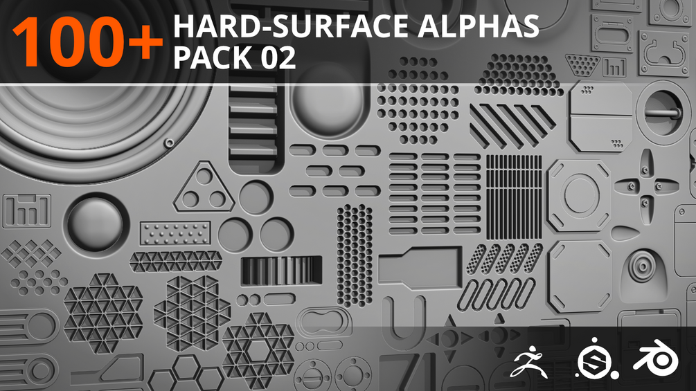 These products contain more than 100+ high-quality Hard-Surface alphas/brushes that can be used with ZBrush, Blender, Substance Painter, Mixer, etc. This is perfect for machinery, Sci-Fi and other Hard-surface Modelling.